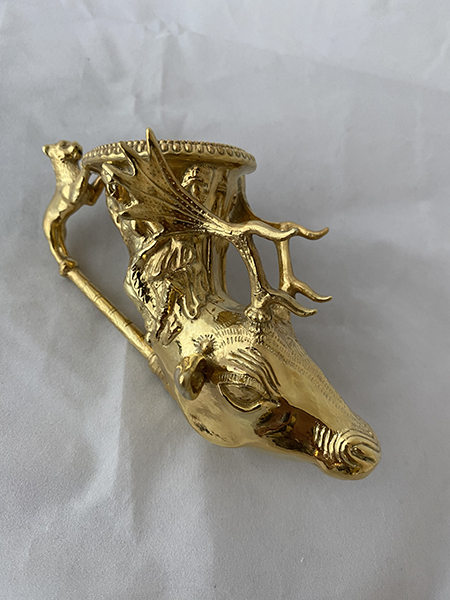 Ритона е ръчно изработен от масивно сребро проба 1000. Тегло 80 гр. Позлата 24 К.